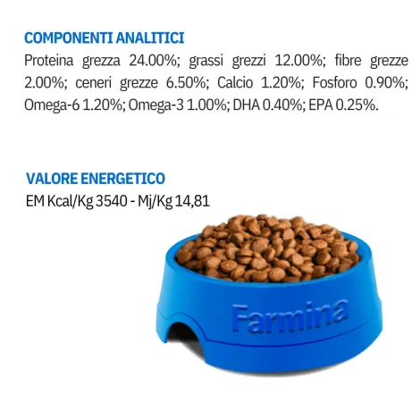Alimento completo ed equilibrato per cani adulti con stati infiammatori o allergici in atto.COMPOSIZIONERiso (55%), pesce disidratato (28%), olio di pesce (8%), polpa di barbabietola essiccata (5%), olio vegetale (2%), fosfato monobicalcico, cloruro di sodio, carbonato di calcio, cloruro di potassio, lievito di birra essiccato (0.3%).